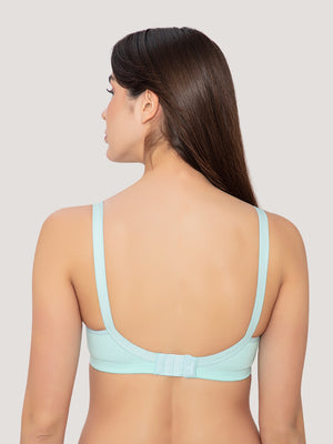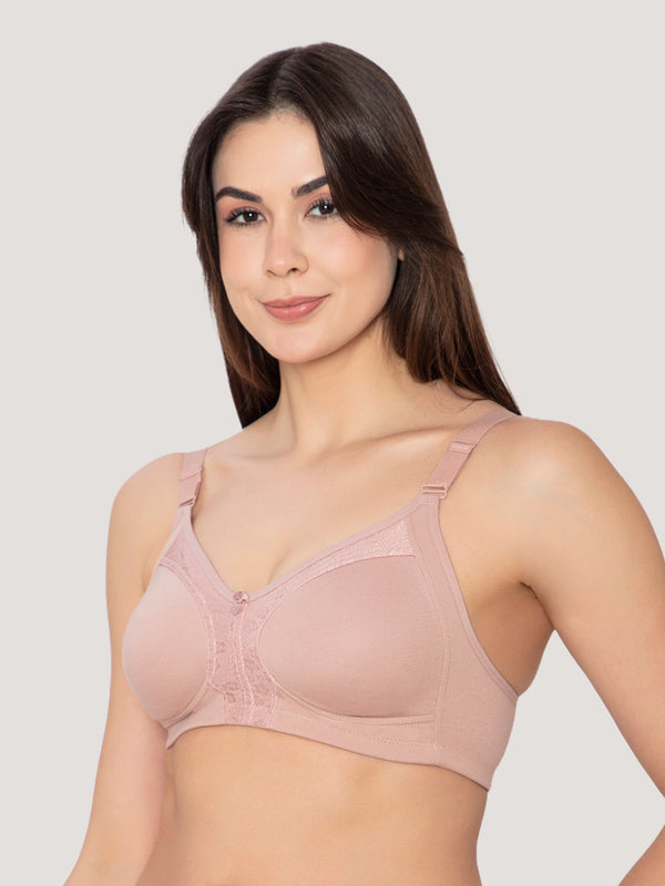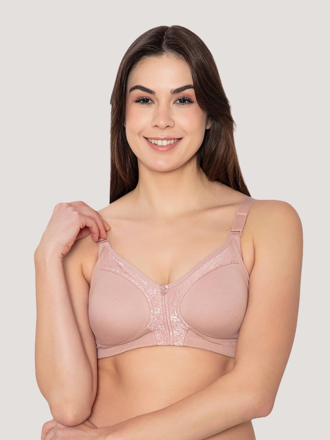 Elevate your everyday essentials with this stunning non-padded bra, designed to blend elegance and ease. The broad adjustable straps provide unmatched comfort, while the broad side wings minimizes chances of spillage. Seamless, non-padded double layered cups ensure a natural fit with full coverage, perfect for all-day wear. Beautiful lace detailing on center gore and lace neckline. The broad, Adjustable straps let you style it your way, and the 3-hook U-shaped back keeps everything secure.
