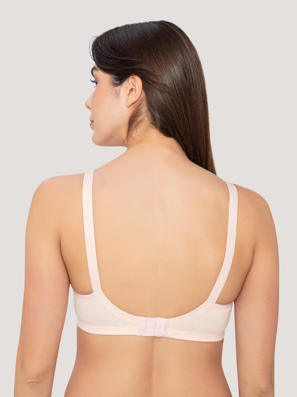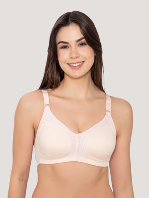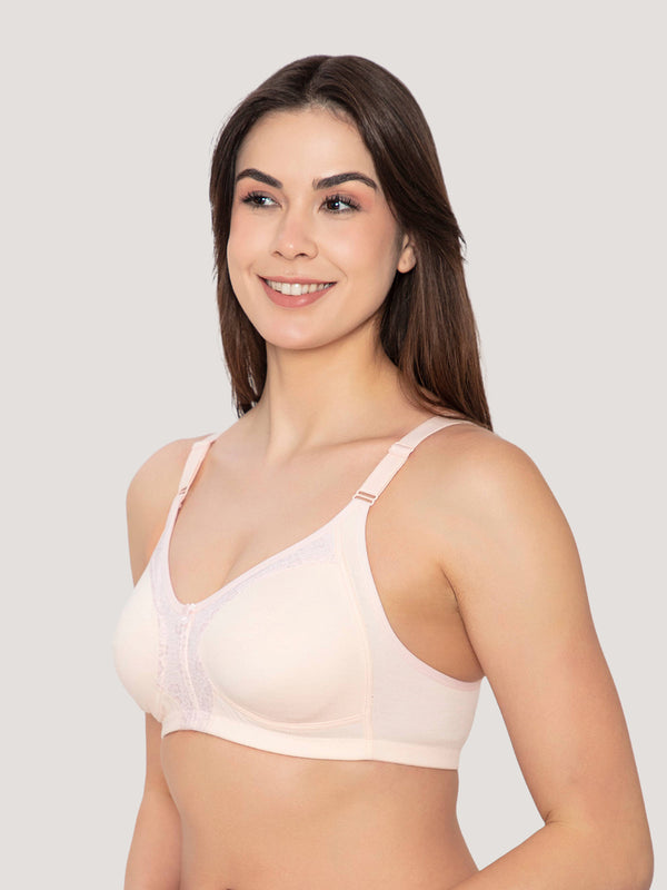 Elevate your everyday essentials with this stunning non-padded bra, designed to blend elegance and ease. The broad adjustable straps provide unmatched comfort, while the broad side wings minimizes chances of spillage. Seamless, non-padded double layered cups ensure a natural fit with full coverage, perfect for all-day wear. Beautiful lace detailing on center gore and lace neckline. The broad, Adjustable straps let you style it your way, and the 3-hook U-shaped back keeps everything secure.