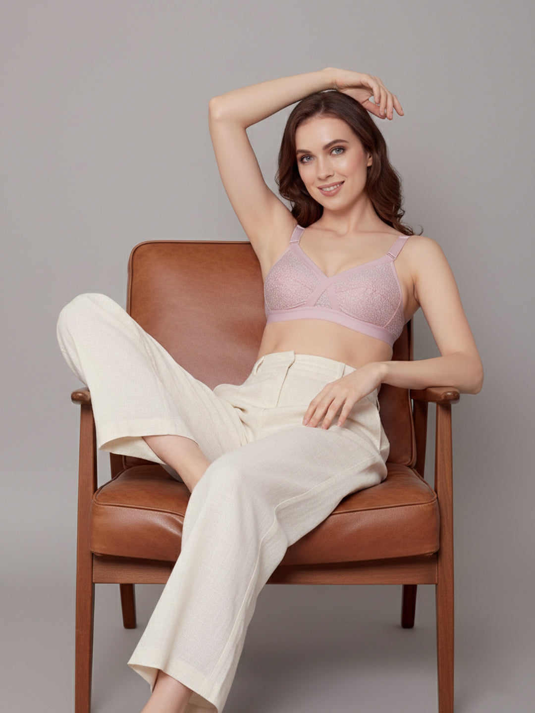Designed for everyday ease, this full coverage non-wired bra features a crossover front design with a minimal print pattern for a clean, modern look. Crafted for all-day comfort, it offers reliable support without underwires, making it ideal for daily wear. The cross elastic detailing at the center front adds extra stability and secure hold, while seamed cups provide natural shaping and enhanced support. Finished with a U-shaped back, 2-hook closure, and broad adjustable straps, this comfortable everyday bra ensures a snug fit, reduced pressure, and effortless movement throughout the day.