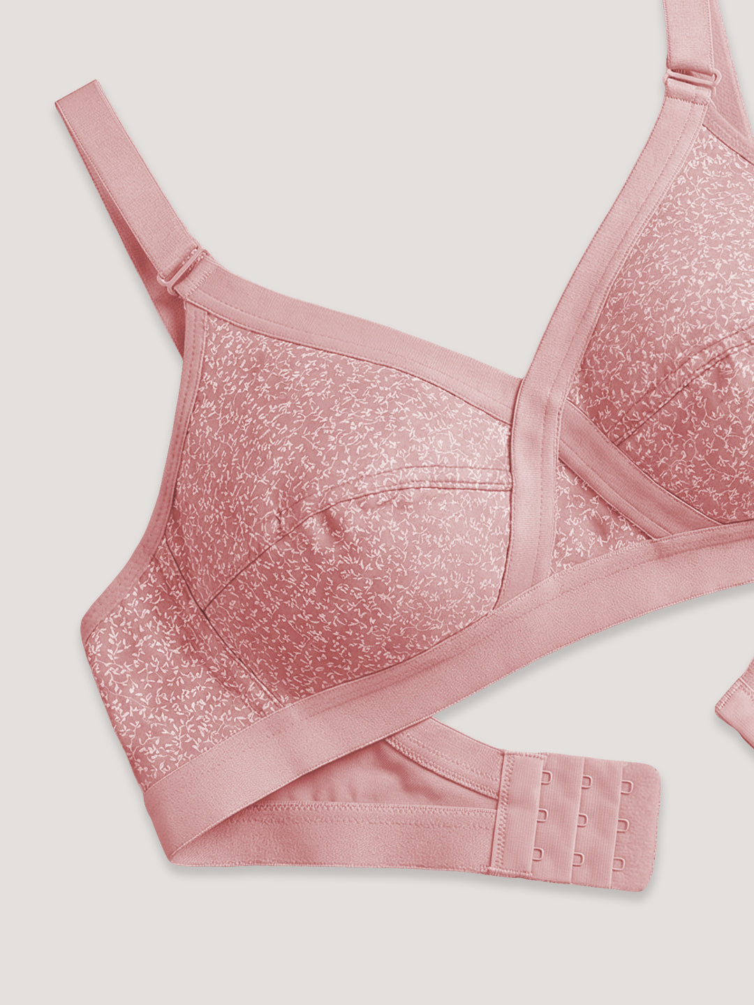 Designed for everyday ease, this full coverage non-wired bra features a crossover front design with a minimal print pattern for a clean, modern look. Crafted for all-day comfort, it offers reliable support without underwires, making it ideal for daily wear. The cross elastic detailing at the center front adds extra stability and secure hold, while seamed cups provide natural shaping and enhanced support. Finished with a U-shaped back, 2-hook closure, and broad adjustable straps, this comfortable everyday bra ensures a snug fit, reduced pressure, and effortless movement throughout the day.